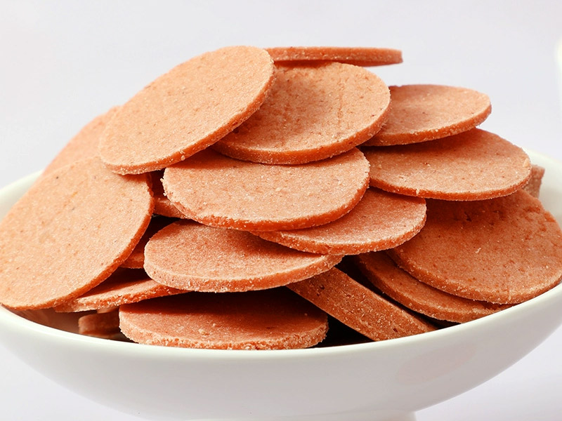 山楂糕:將熬制好的果漿倒入模具中,冷卻定型,再送入低溫烘干房,以適宜溫度和濕度進(jìn)行烘干,使山楂糕達(dá)到 Q 彈有嚼勁的口感。 山楂片:將濃縮后的山楂泥均勻鋪在烘干盤上,通過多層網(wǎng)帶式烘干機(jī)進(jìn)行分段烘干,精確控制各階段的溫度和風(fēng)速,使山楂片達(dá)到酥脆可口的品質(zhì)。